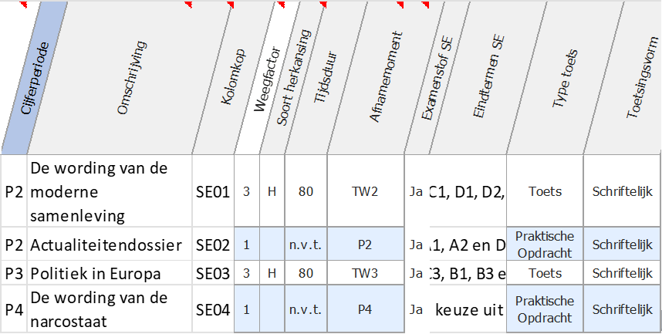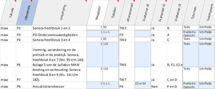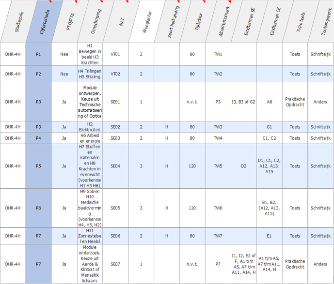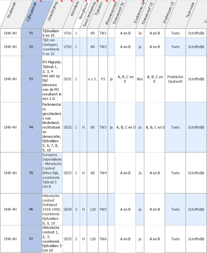 Vakcode Cijferperiode Omschrijving Kolomkop Weegfactor Tijdsduur Afnamemoment Type toets Uitgebreide uitleg te P1 Praktische opdracht 1 VT01 1 n.v.t. P1 Praktische Opdracht Basistechnieken te P1 Kunstbeschouwing en klassieke oudheid VT02 1 80 TW1 Toets te P2 Praktische opdracht 2 VT03 1 n.v.t. P2 Praktische Opdracht Verdieping van techniek te P2 Renaissance VT04 1 80 TW2 Toets te P3 Praktische opdracht 3 VT05 1 n.v.t. P3 Praktische Opdracht Verbeelden en beeldaspecten te P3 19e eeuw VT06 1 80 TW3 Toets te P4 Praktische opdracht 4 SE01 1 n.v.t. P4 Praktische Opdracht Kunstenaars collectief te P4 Cultuur van het moderne VT07 1 80 TW4 Toets te P4 Praktische opdracht 5 SE02 1 n.v.t. P4 Praktische Opdracht Diaspora te P7 Portfolio SE03 1 n.v.t. P7 Praktische Opdracht Portfolio van beeldend werk. te P7 Eindopdracht SE04 1 n.v.t. P7 Praktische Opdracht Eindopdracht, laatste praktijkwerk, keuzeopdracht. -